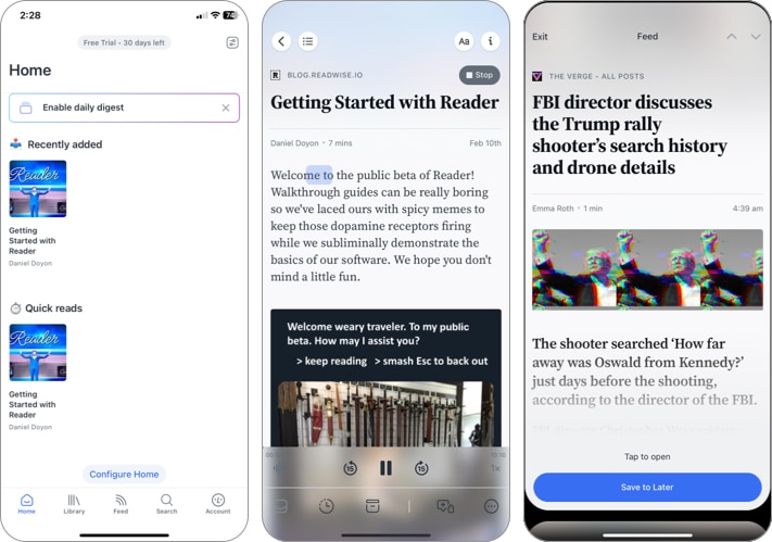 Daha sonra tekrar ziyaret etmek için okuduklarını vurgulamaları ve bilgileri kaydetmesi gerekenler için mükemmel bir uygulama. Fotoğrafları, bağlantıları, zengin metinleri ve hatta Web sayfalarını Readwise'da açıklayabilir ve vurgulayabilirsiniz. Ayrıca, metin-konuşma özelliği, gerçek bir insanın gerçekçi sesi ile haberleri veya makaleleri anlatıyor.