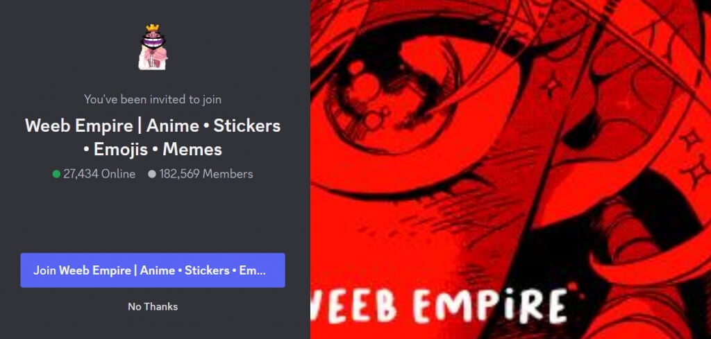 Bir diğer popüler anime etiketli sunucu Weeb İmparatorluğudur. Dünyanın her yerinden oyuncuları ve anime severleri toplar ve hepsi potansiyel yeni arkadaşlarınızdır. Bu sunucu hakkında bu kadar özel olan nedir? Oradaki en aktif anlaşmazlık topluluklarından biri. Herhangi bir anda yaklaşık 30.000 üyesi var ve hepsi sohbet ediyor ve sosyalleşiyor.