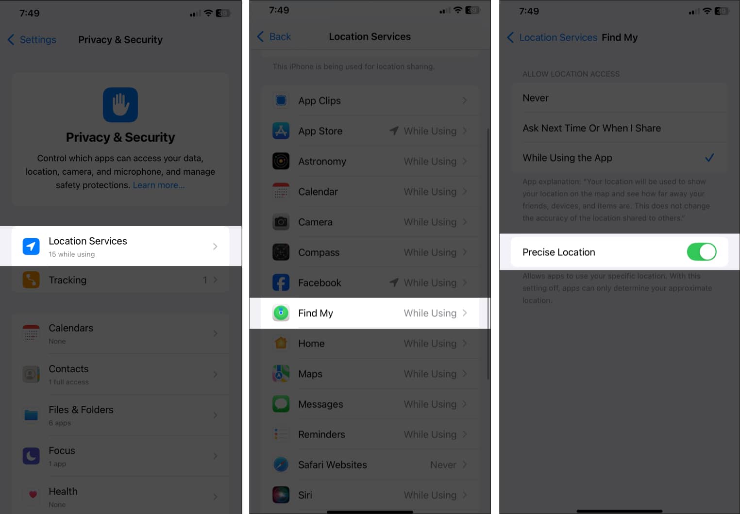 Ayrıca, eşyalarınızı kolayca bulabilmeniz için airtag hassas bulgularının etkin olduğundan emin olun. Bunu yapmak için,Ayarlar→Gizlilik ve Güvenlik→Konum Hizmetleri→Bulve başa çıkKesin konumseçenek. Şimdi, bulduğumda AirTag'ı takip edip edemeyeceğinizi kontrol edin.