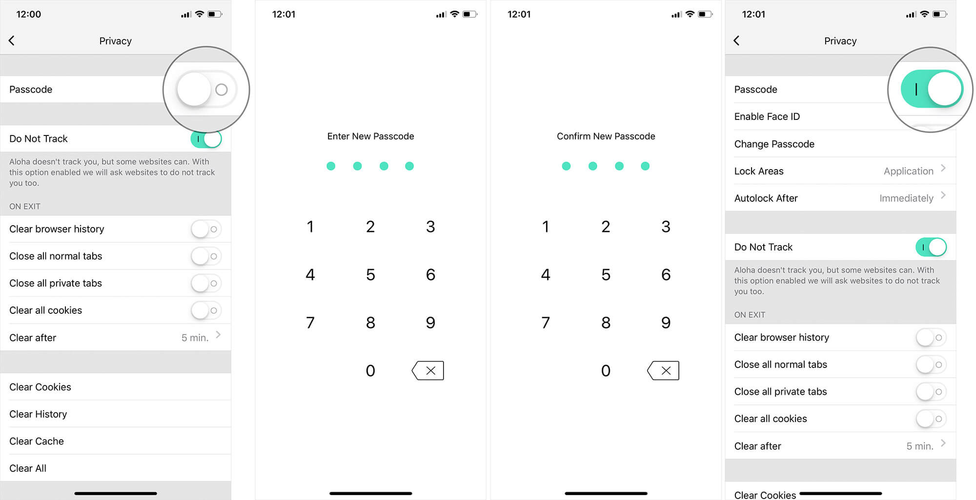 Sizin için daha fazla güvenlik. Diğer web tarama uygulamalarının aksine, Aloha uygulamayı bir şifre ile kilitlemenize izin verir. Geçidinizi Aloha ayarlarından ayarlayabileceğiniz için herhangi bir üçüncü taraf kilitleme uygulamaları kullanmanız gerekmez.