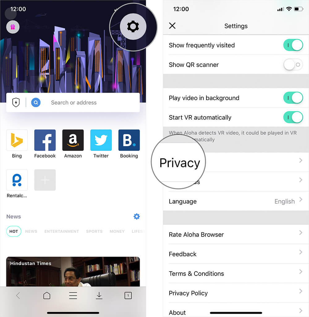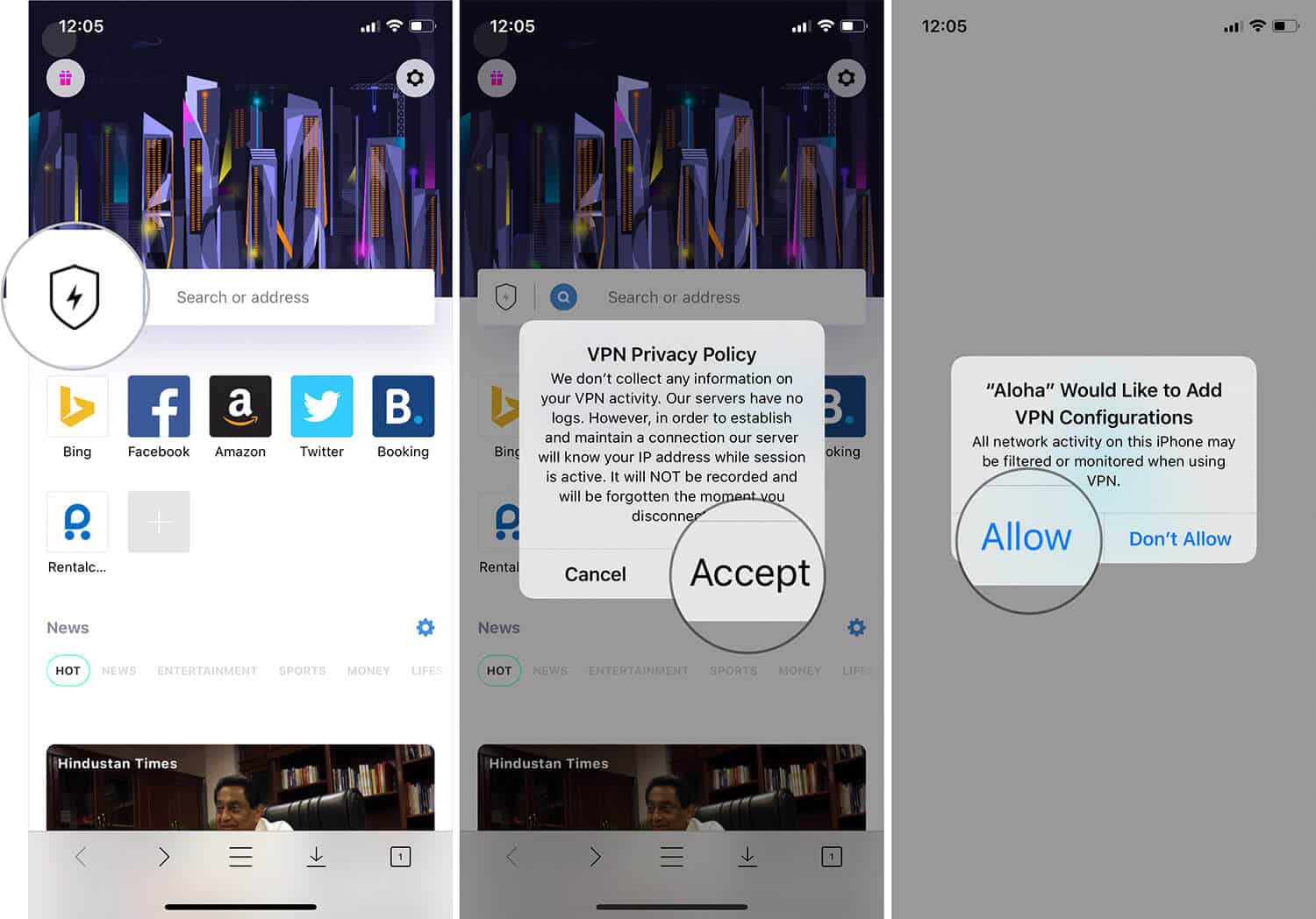 Arama çubuğundan önce bu VPN simgesine dokunun ve uygulamaya gerekli izinleri verin; Şimdi gitmekte fayda var. Aloha'yı kapattığınızda, uygulamanın VPN'yi devre dışı bırakacağını unutmayın; Bir dahaki sefere, web sitelerine göz atmadan önce bu özelliği etkinleştirmek için VPN simgesine dokunmanız gerekir. Aloha, daha az bant genişliği kullanmak için VPN trafiğini sıkıştırır ve şifreler.