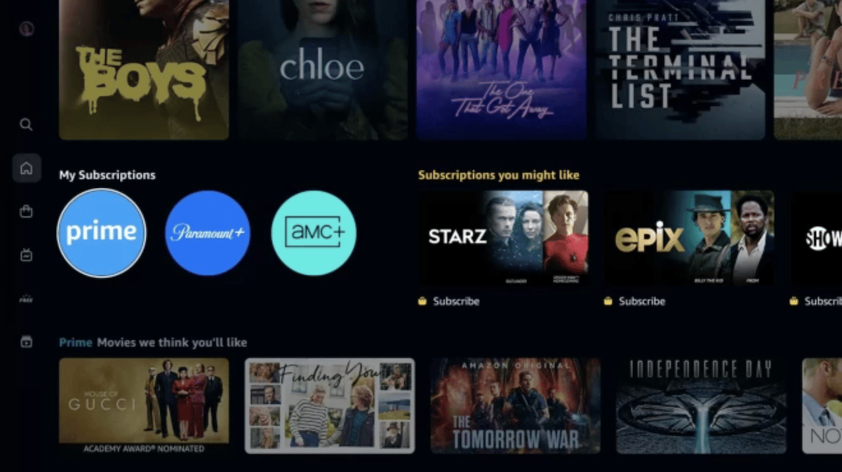 Apple TV'deki yeni Prime Video uygulamasında, yeni gezinme menüsü ekranın yanına taşındı ve altı birincil sayfa içeriyor: ev, mağaza, bul, canlı TV, reklamlarla ücretsiz ve eşyalarım.