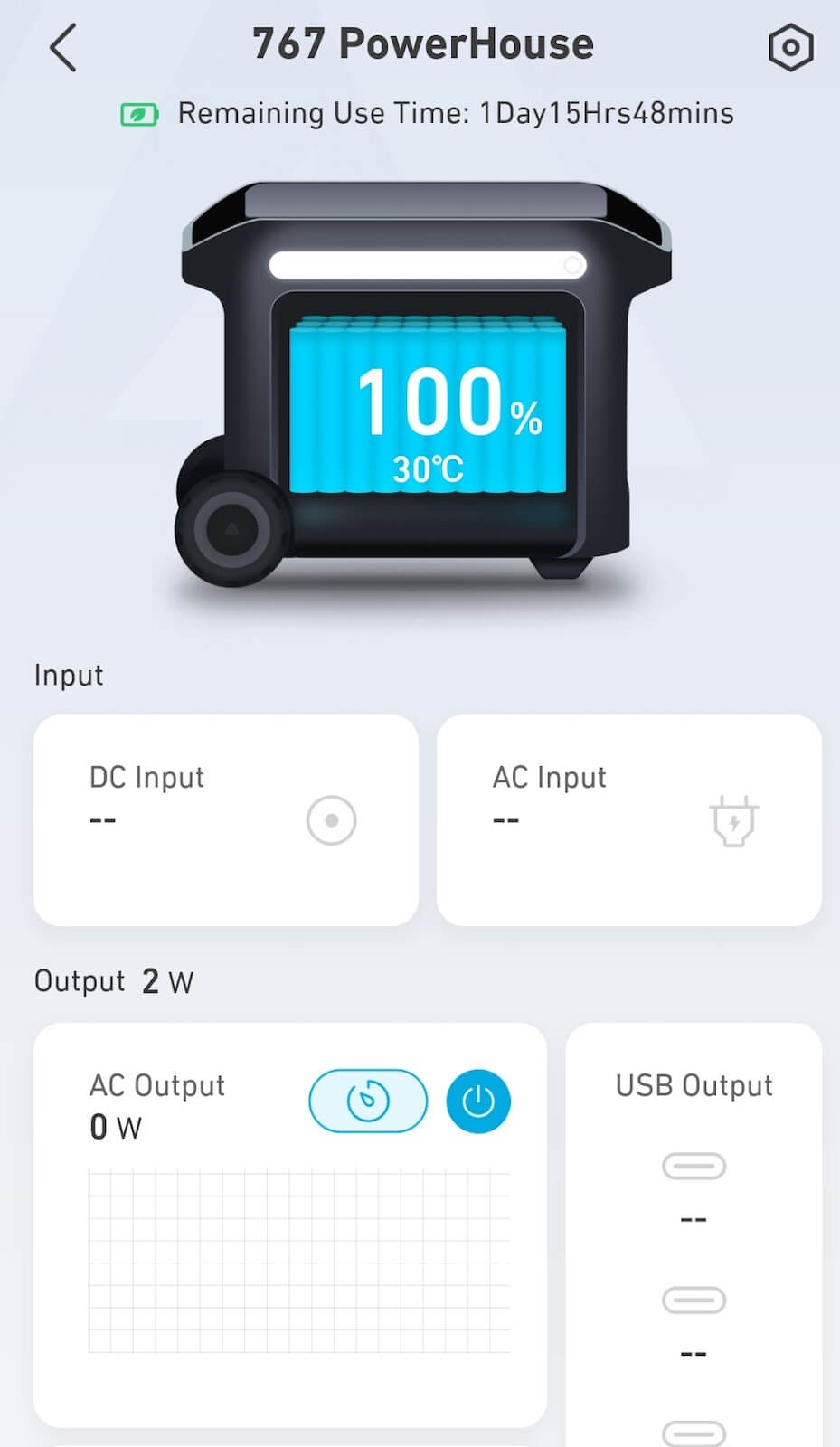 Ekran ayrıca, şu anda hangi çıkışların kullanımda olduğunu gösteren simgeleri ve mevcut güç çekilişine göre kalan çalışma zamanının bir tahminini gösteriyor. Bu tahminler çeşitli şarj koşullarına bağlı oldukları için doğru olmasa da, bunları sergilemek hala yararlıdır.