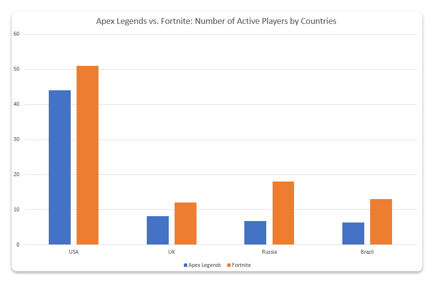 Kuşkusuz, bu iki oyun dünya çapında çok popüler. ABD'de Apex Legends, toplam oyuncu sayısının% 38,92'sine sahiptir; Fortnite için%21.63. Ayrıca, söz konusu diğer ülkelerin yüzdesini de topladık.