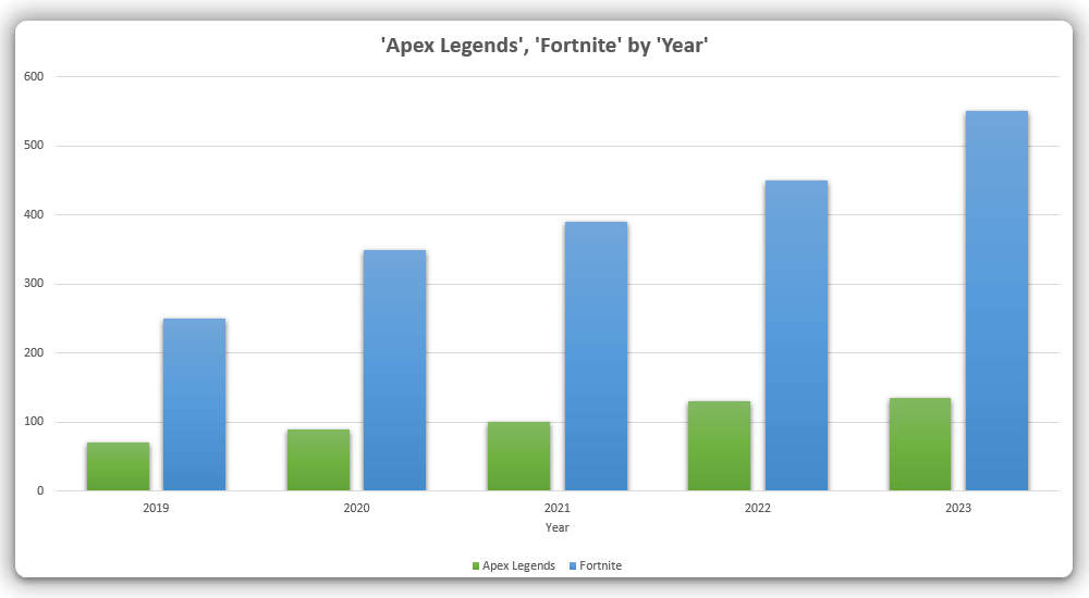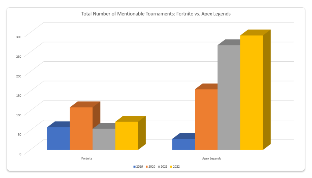 Esports listelerine göre, hem Apex hem de Fortnite birçok resmi ve resmi olmayan turnuvaya sahipti. Aşağıdaki tablolar 2019'dan 2022'ye kadar bu iki oyun için turnuva sayısını göstermektedir.