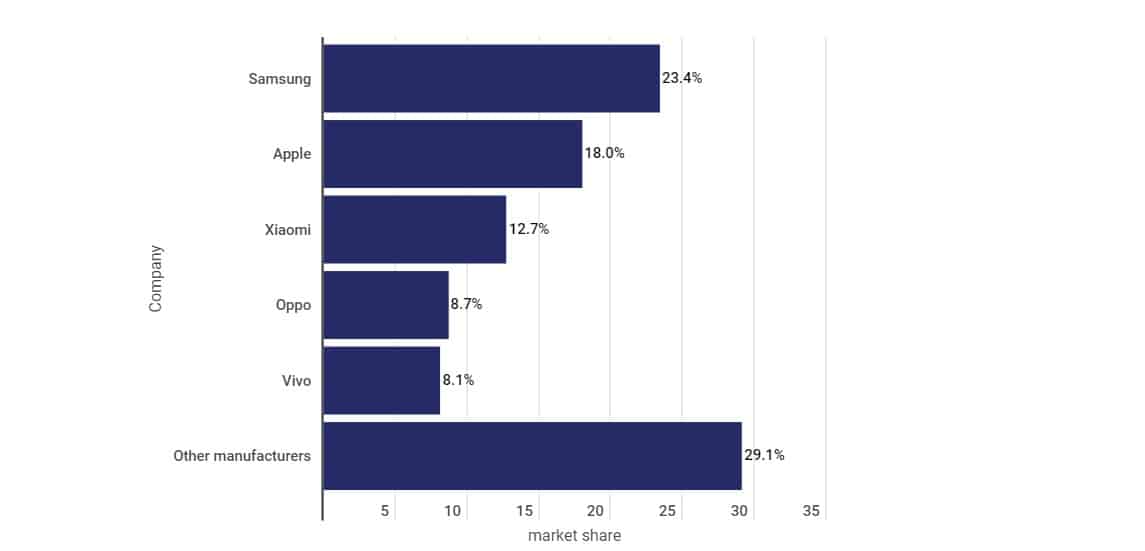 Çinli üreticiler Xiaomi, Oppo ve Vivo, 2022'de ilk beş akıllı telefon satıcısını tamamladı. Xiaomi, küresel akıllı telefon pazarının% 13'ünü oluştururken, Oppo ve Vivo ise piyasanın sırasıyla% 8,7 ve% 8.1'ini ele geçirdi. Diğer üreticiler pazarın o çeyrek için gönderilerinin% 29,1'ini oluşturdu.