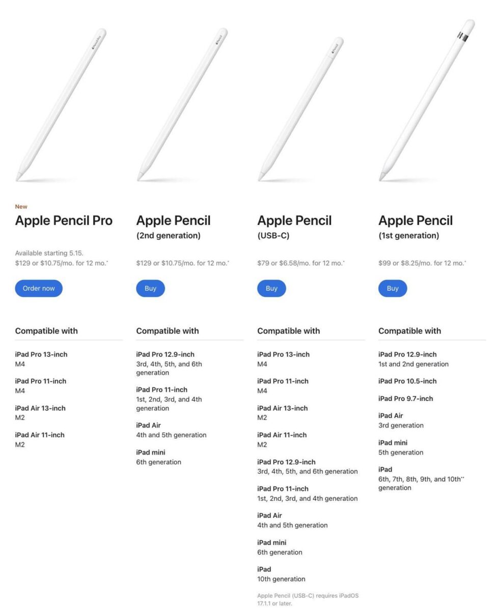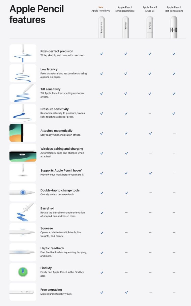 Şimdi Apple'dan 4 farklı kalemimiz var. Bu hiç kafa karıştırıcı değil, işte size yardımcı olacak bir karşılaştırma grafiği. Yeni Apple Pencil Pro, iPad Air M2 11 inç ve 13 inç modellerle ve iPad Air M4 11 inç ve 13 inç modellerle uyumludur.