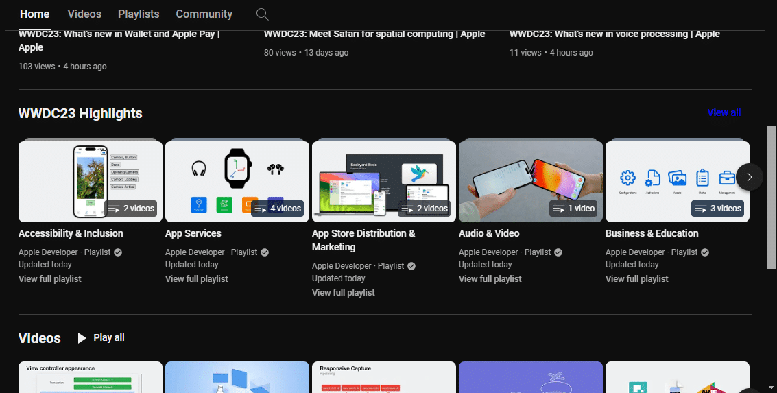 Apple geliştiricisi YouTube kanalı, dünya çapında 24 bölgesel kanalı tamamlayan beşinci resmi Apple kolu olarak hizmet vermektedir. App Store, Swift Programlama Dili, Mekansal Hesaplama, Safari Güncellemeleri ve daha fazlası gibi çeşitli konuları kapsayan küratörlü çalma listeleri sunar. Bu organize yaklaşım, geliştiricilerin ilgi alanlarına ve ihtiyaçlarına göre uyarlanmış ilgili içeriği hızlı bir şekilde bulabilmelerini sağlar.