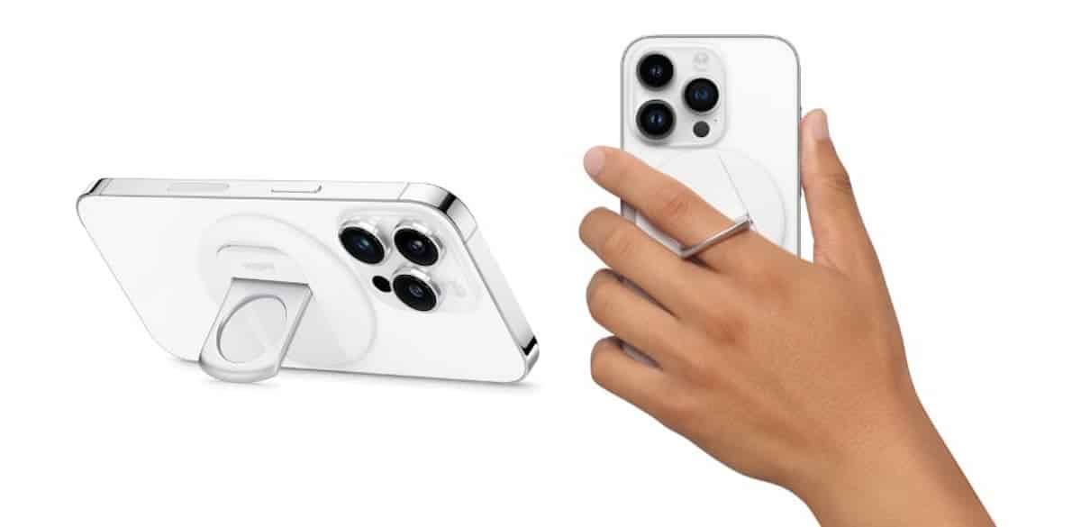 MacOS Ventura'da süreklilik kamerası için optimize edilmiş olan Belkin iPhone Mount, iPhone'un arkasına manyetik olarak bağlanır ve dizüstü bilgisayarda kolayca sabitlemek ve iPhone'u portre veya manzaraya döndürmek için bir halka kavrama ve kickstand içerir.