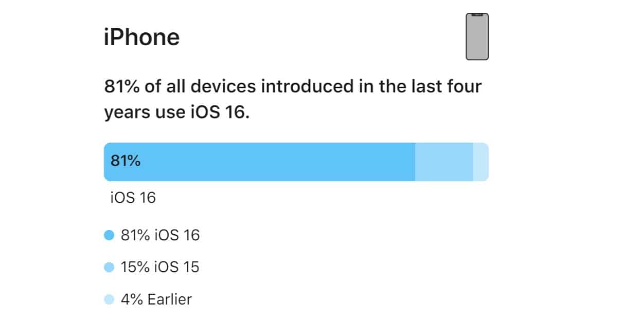 Apple tarafından paylaşılan benimseme istatistikleriortaya çıkarmakTüm iPhone'ların% 15'inin hala iOS 15'ini kullanırken, son dört yılda üretilenlerin% 81'i iOS 16'nın bir versiyonunu çalıştırıyor. İPhone'ların% 4'ü hala önceki iOS sürümlerini yürütüyor.