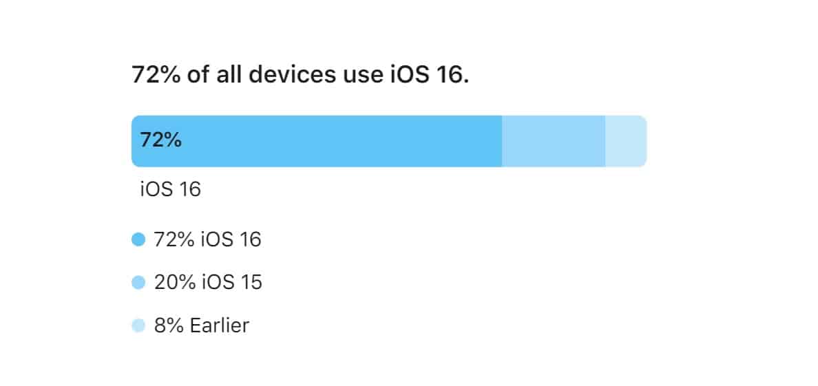 İPhone'ların% 20'si hala iOS 15'deyken, tüm iPhone'ların% 72'si iOS 16 çalıştırıyor. Tüm iPhone'ların yaklaşık% 8'inde iOS'un önceki bir sürümü mevcut.