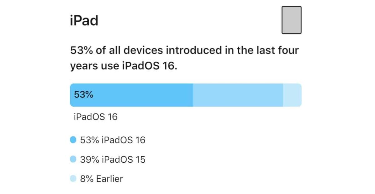 İPados 16'ya gelince, son dört yılda yayınlanan tüm iPad'lerin% 53'ü iPados 16'yı çalışıyor,% 39'u iPados 15'i ve% 8'i daha eski bir yazılım sürümü çalışıyor.