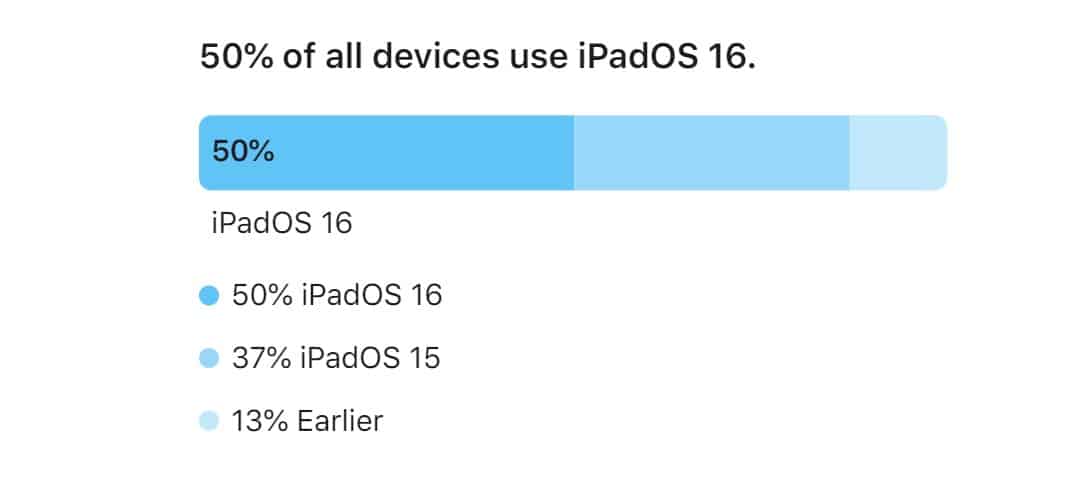 Tüm iPad'lerin yüzdeleri karşılaştırılabilir,% 50 iPados 16 ve% 37 iPados 15 ve% 13'ü daha önceki bir sürümü kullanarak çalıştırıyor.