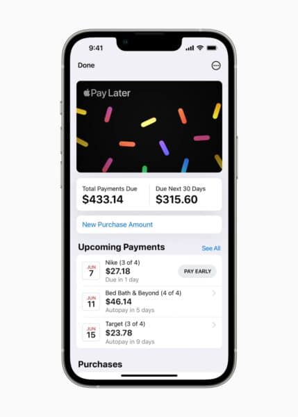 WWDC 2022 sırasında duyurulan Apple Pay daha sonra, ABD'deki müşterilerin bir satın alma işlemini altı hafta boyunca dört eşit ödemeye ayırmasına izin verecek bir hizmettir, faiz veya ücret ödemez. Hizmet, kullanıcıların ödemelerini kolayca görüntüleyebilmesi, izleyebilmesi ve geri ödeyebilmesi için başlatıldığında cüzdan uygulamasında mevcut olacaktır. MasterCard Network'ü kullanarak Apple Pay daha sonra, Apple Pay'ın çevrimiçi veya uygulama içi kabul edildiği her yerde mevcut olacaktır.