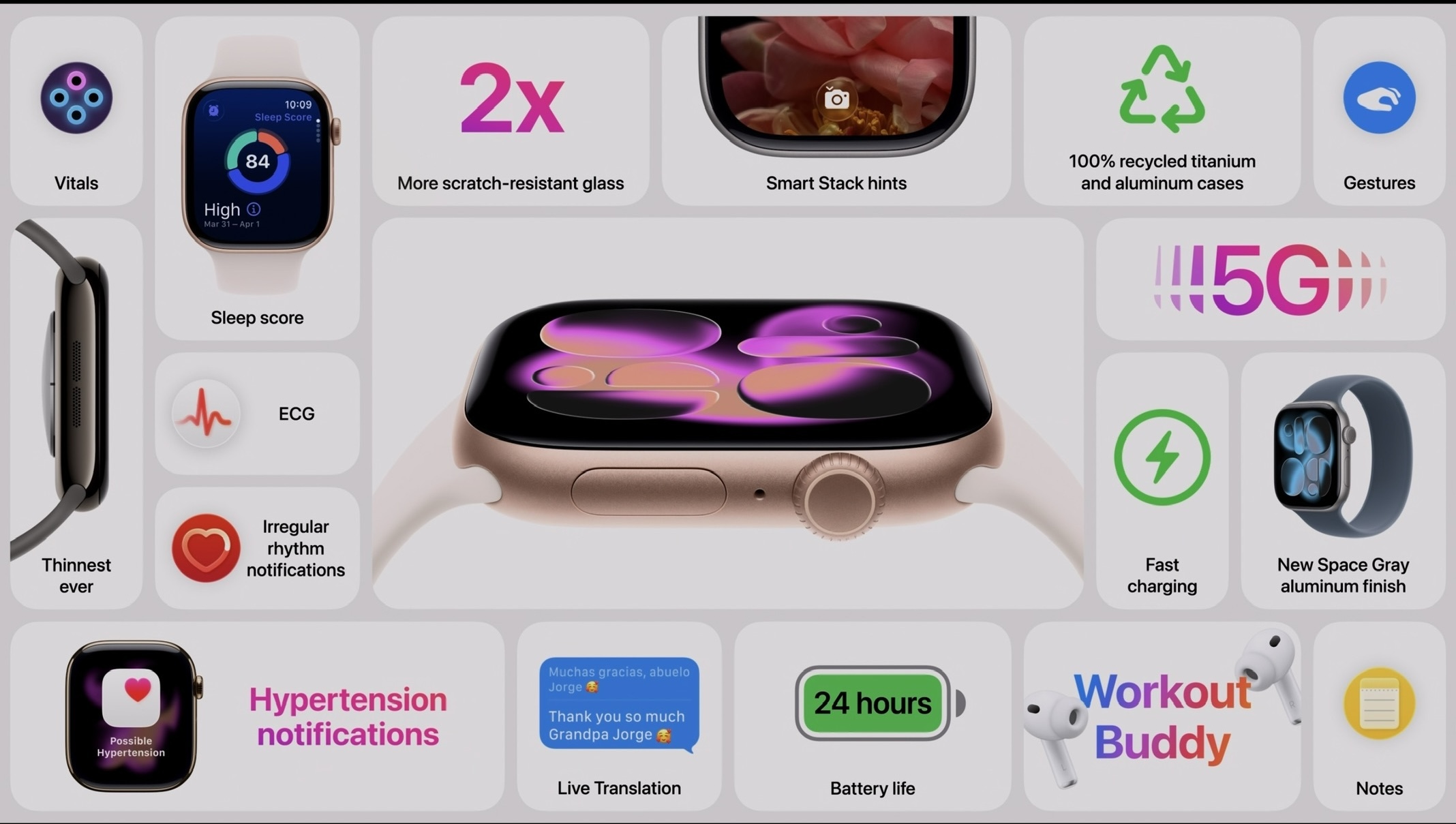 Apple Watch Serisi 11, 42mm ve 46mm kasa boyutlarında geliyor. Alüminyum kaplamalar arasında jet siyahı, gümüş, gül altın ve yeni bir alan gri, cilalı titanyum modelleri doğal, altın ve arduvazda sunulmaktadır. Hermès Edition yeni Faubourg Party ve Grand H metal bağlantı bantlarıyla geri döner ve mevsimsel diziliş, orman, neon sarı, ankraj mavisi ve mor sis gibi yeni bant renklerini içerir. Fiyatlandırma 399 $ 'dan başlıyor, ön siparişler şu anda açılıyor ve 19 Eylül'den itibaren ABD, İngiltere, Japonya ve BAE de dahil olmak üzere 50'den fazla ülkede kullanılabilirlik.