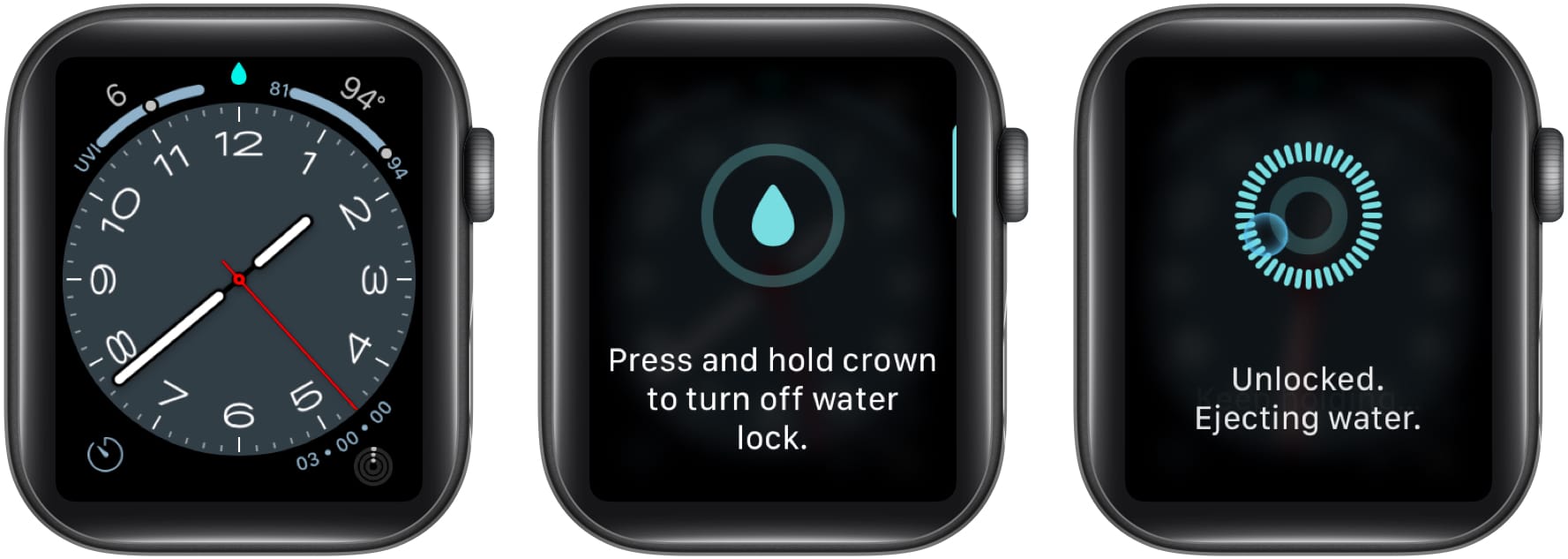 Bunu kontrol etmek için, saat yüzünün üstünde mavi bir su damlacık simgesi arayın. Bir su damlacık simgesi görürseniz ve Apple Watch, WatchOS 9 veya daha sonra çalıştırıyorsa, basılı tutun.Dijital taçSu Kilidi özelliğini devre dışı bırakmak için. Ancak elma saatiniz WatchOS 8 veya daha önce çalıştırıyorsa,Dijital taçsu kilidini devre dışı bırakmak için.