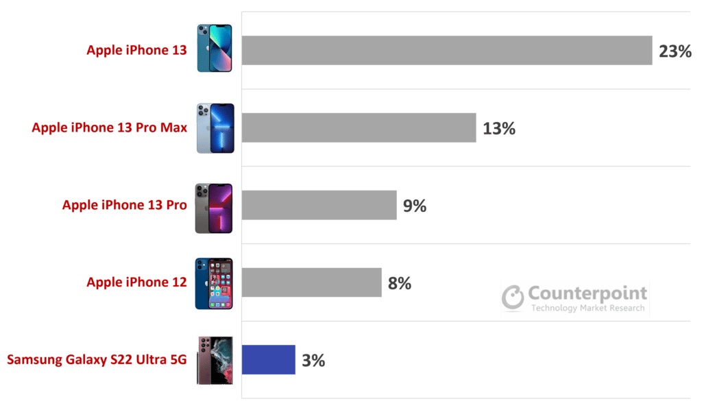 Yakın zamanda Compoint tarafından yayınlanan başka bir raporda Apple, küresel en çok satan akıllı telefonu iPhone 13 ve diğer modelleriyle yönetti ve ardından Samsung. En iyi 10 model, toplam akıllı telefon pazarının% 21'ini yakaladı ve Apple pazarın% 12,3'ünü yakaladı.