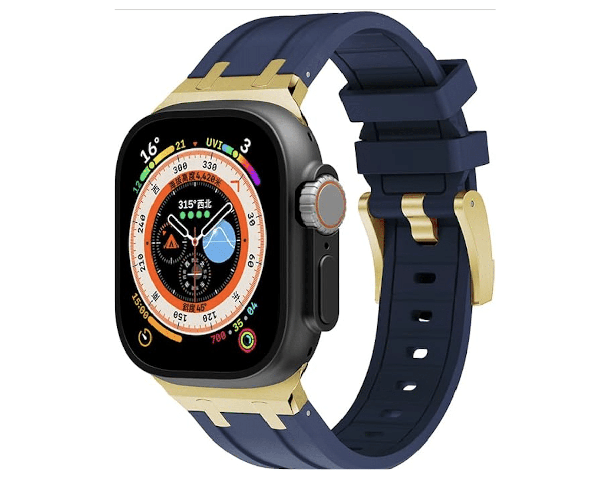 Mryuesg bir saat grubu sunarDayanıklılık ve rahat uyum için yüksek kaliteli silikon ve paslanmaz çelik ile yapılmış altın ve gümüş konektör ve tokalar ile Apple Watch Ultra 2 için.