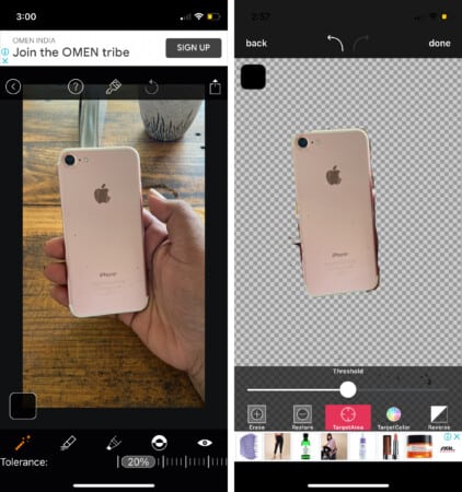 Sihirli silgi arka plan düzenleyicisi etkileyici bir dizi özellik sunar. Her zamanki silme, geri yükleme, ters maskesi ve kırmızı göz özelliklerini elde edersiniz. Bence, bu uygulamanın en büyük çekilişi Magic Wand özelliğidir. Arka planı silmek için bir hedef alan seçmenizi sağlar.