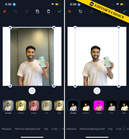 Dokun+düğme ve görüntüyü seçinFotoğraf kütüphanesi. Sıradaki, resme dokunun ve seçinArka planı geri yükleondanDüzenlemekseçenek. Uygulamanın sihrini çalışmak ve arka planı otomatik olarak görüntüden kaldırmak için birkaç saniye sürecektir.