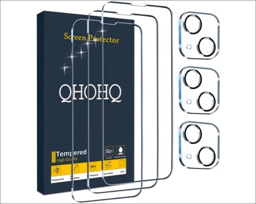 QHOHQ, 2. sırada bir koruyucu sunar. İPhone 13 ekran koruyucusu ve kamera koruyucusu ile birlikte gelir. 9H sertliği, 2.5D yuvarlak köşeleri, 0.33 mm temperli cam ve pürüzsüz, çizilmemiş bir kenara sahiptir. Daha sonra, gece parlama karşıtı kaplama cihazınızı su, yağ, toz, parmak izleri ve çiziklerden koruyacaktır.