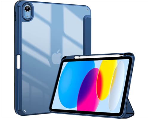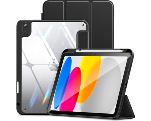 Fintie, 10.9 inç iPad (10. nesil) için şeffaf durumlar listesinde iyi bilinen bir başka isimdir. Sert polikarbonattan yapılmış sert açık bir arka kabuğa sahip üç katlı bir folio kılıfı sunar. Bu yüzden kırılmasından endişe etmenize gerek kalmayacak. Ayrıca, esnek TPU tamponu iPad'inizi bırakmış tutar ve yumuşak bir mikrofiber iç cephesi sergilenen çizikleri en aza indirir.