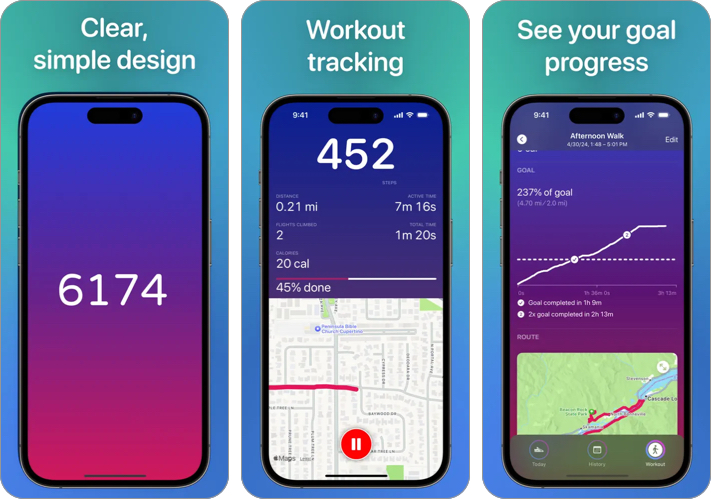 Uygulama ayrıca bir hedef belirlemenizi sağlar. Yürürken, renkler ilerlemenizi yansıtacak şekilde değişir. Basit ve açık arayüzünü ve kullanımı kolay özelliklerini seviyorum. Genel olarak, günlük aktiviteyi izlemek ve sizi formda kalmaya motive etmek için mükemmel bir araçtır.