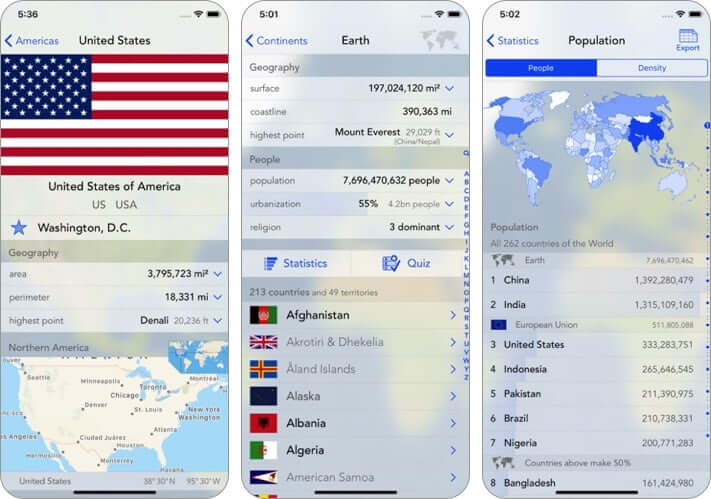 Hepsi bu değil, aynı zamanda bir mini harita ile birlikte geliyor, böylece kıtadaki yerini kontrol edebilirsiniz. Ayrıca, uygulama bir ülke hakkında derinlemesine bilgi edinmenizi sağlamak için GSYİH, işsizlik ve kentleşme hakkında daha iyi bir fikir sunar. Bu uygulamanın en sevdiğim özelliklerinden biri, tüm ülkeleri GSYİH, alan ve nüfus gibi çeşitli önemli parametrelere göre sıralama ve karşılaştırma yeteneğidir.