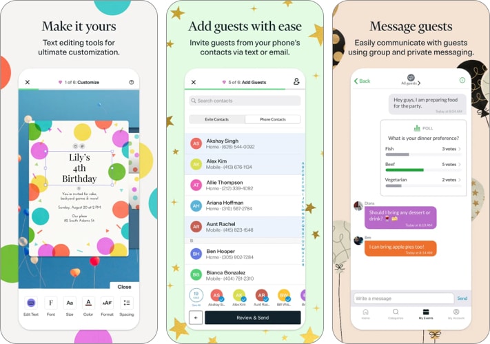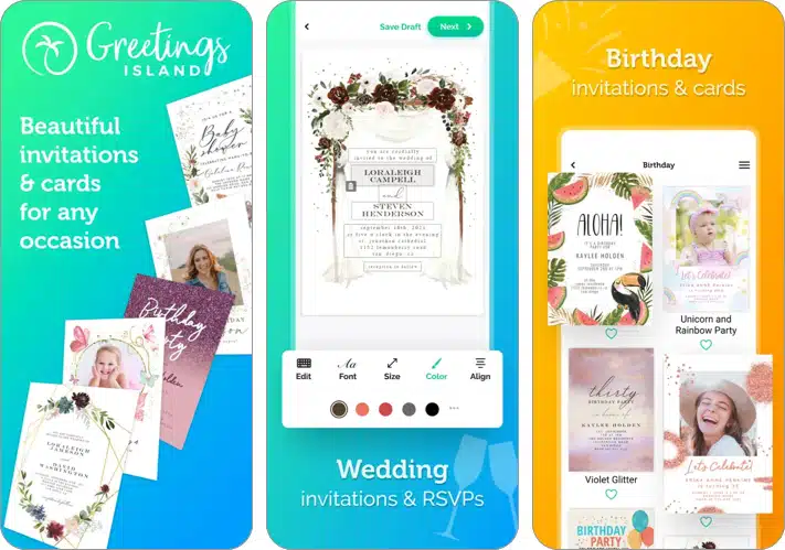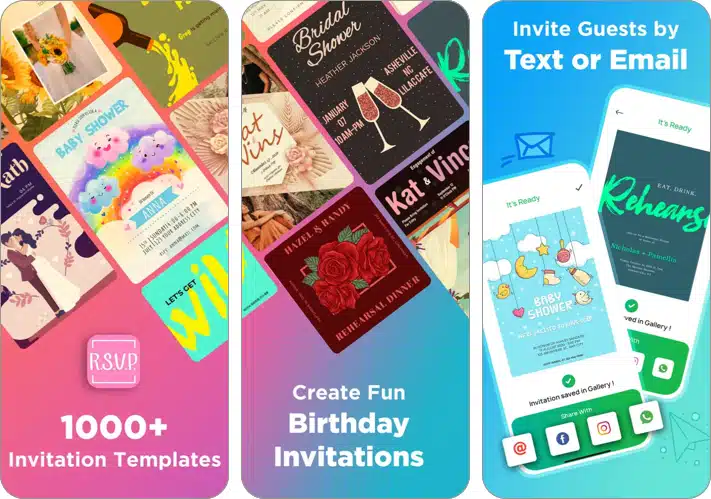 Bu kart üreticisi uygulaması ayrıca e -posta, metin ve daha fazlası gibi birden fazla ortam aracılığıyla davetler göndermenizi sağlar. Ayrıca, RSVP'leri yakından izlemeyi ve herhangi bir güçlük olmadan yönetmeyi çok kolay hale getirir.