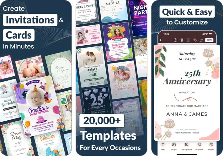 Ayrıca, bu davet yapıcı uygulaması tonlarca profesyonelce hazırlanmış tasarım sunuyor. Davet kartınızın sevimli görünmesi için fotoğraflar, koyu renkler ve çekici metin kullanabilirsiniz. Kartı tasarladıktan sonra, indirebilir, basılabilir veya tüm arkadaşlarınıza gönderebilirsiniz.