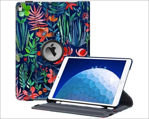 Fintie dönen kasa büyüleyici bir tasarım tasvir ediyor. Deri kasa gözlere oldukça hoş görünüyor. Kullanıcı dostu hale getiren yerleşik bir kalem tutucu ve adaptör yuvası ile birlikte gelir. Kılıfta, iPad'de güzel görünen bir dizi tasarım seçeneği ile temiz bir sanat var.