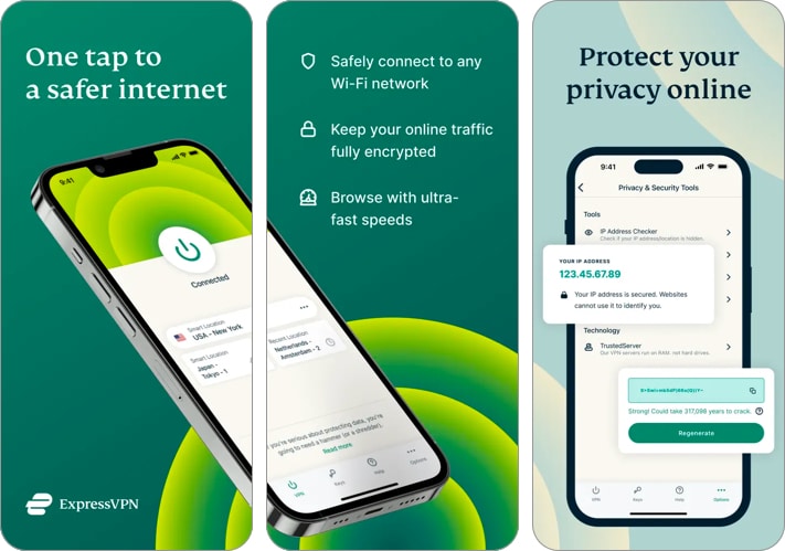 ExpressVPN, şifreleme yoluyla, dünyanın 105 ülkesinde güvenli sunucular için kolay bağlantı sunar. Ayrıca, uygulama akış oturumlarınızın güvenlik standartlarını geliştiren sağlam bir şifre yöneticisi bulunmaktadır. Şifreleri oluşturabilir, depolayabilir ve girebilir, kredi kartı verileri kaydedebilir ve veri tehditlerine zamanında uyarılar alabilirsiniz.Ayrıca, iPhone'lar için başka verimli VPN hizmetleri, kesinlikle biratış.