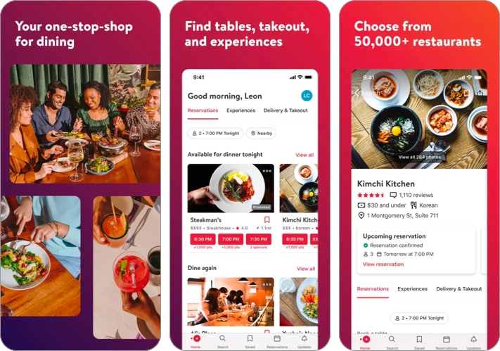 Uygulama, yerel restoranlara ve hatta ziyaretçilere sınırlı erişimi olan kaliteli restoranlara anında rezervasyon yapmanızı sağlar. Bazı fantastik indirimler, ücretsiz yemekler ve OpenTable ile özel davet etkinliklerine özel erişim elde edebilirsiniz. Portal, kullanıcıları rezervasyon yapmak, arkadaşlara yönlendirmek ve inceleme yazmak için ödüllendirir.