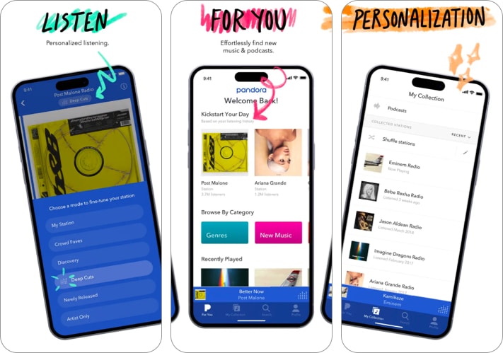Pandora, müzik severler için en iyi iPhone uygulamalarından biridir. Her odyofilin kaprislerine zahmetsizce hitap edebilen çeşitli şarkı ve podcast koleksiyonuna sahiptir. Tercih ettiğiniz şarkı başlığını, sanatçıyı veya türü arayın ve ekranınızda saniyeler içinde görünmesini izleyin.