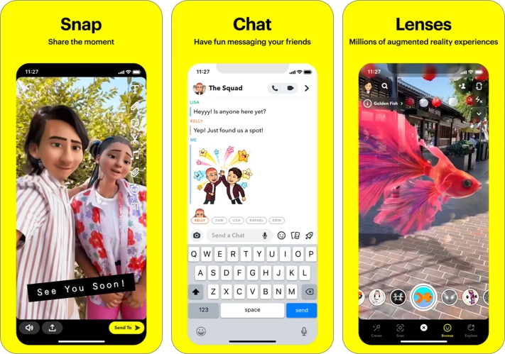Instagram gibi Snapchat, resimleri tıklamanıza, videoları kaydetmenize ve arkadaşlarınızla anında paylaşmanıza olanak tanır. Uygulama, normal görüntülerinizi sosyal medya portalları için mükemmel tıklamalara dönüştürmek için bol miktarda eğlenceli, etkileşimli filtreye sahiptir. Hikayeler ekleyebilir, sohbet bölümünde sohbet edebilir veya Discover Feed'de yeni içerik keşfedebilirsiniz.