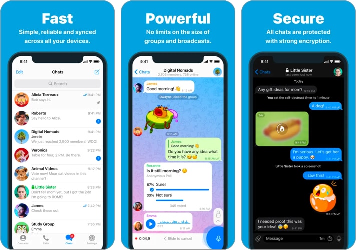 Veri paylaşımı ile ilgili olarak Telegram, kullanıcılarının 2 GB'a kadar büyük video ve belgeleri paylaşmasına izin verir. Resimlerinizi ve videolarınızı bile düzenleyebilir ve daha kişiselleştirilmiş bir görünüm için emoji ve gif ekleyebilirsiniz. Telgrafta yaptığınız her konuşma, iPhone'unuzu veri dökümünden kurtararak bulutta kalır. Sezgisel filtrelerle eşleştirilmiş kesintisiz arayüz, Telegram'ı değerli bir seçim haline getiriyor.