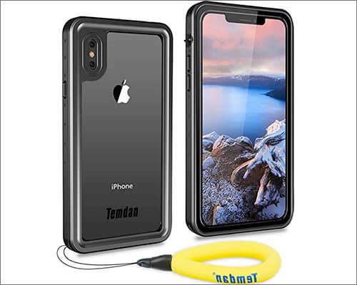 Temdan, birden fazla fayda sunan su geçirmez bir kutu sunar. IP68 sertifikalı su geçirmez standardın yanı sıra, bu durum bilek kayışı ve şamandıra kayışı ile birlikte gelir; İkincisi iPhone'unuzu yüzeyde yüzüyor.