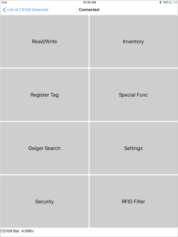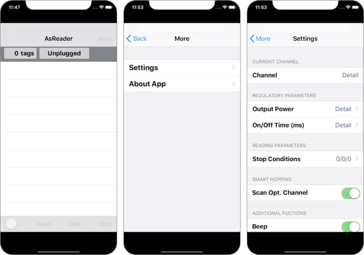 Bu uygulama RFID ASReader (ASR-030D) ile birlikte çalışır. Yıldırım konnektörü aracılığıyla iOS cihazına bağlanan bir vaka montaj okuyucudur. RFID etiketlerini okumanıza izin vermek için spotsuz bir şekilde çalışır.