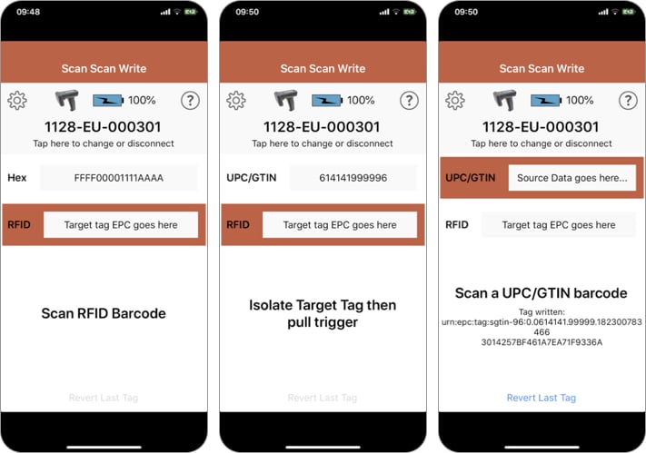 “RFID SCAN SCAN WRITE”, UHF RFID etiketlerini endüstri standartlarına ve özel EPC'lerle devreye almada mükemmeldir. TSL Bluetooth UHF RFID okuyucu ile uyumludur. GS1 barkod bilgilerini hızlı bir şekilde alacak ve daha sonra GS1 SGTIN-96, GRAI-96 veya GIAI-96 uyumlu EPC'lerle etiketleri kodlayacaktır.