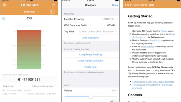 Duyarlı sesli, sinyal gücü geri bildirimi ve gelişmiş grafik sinyal ölçer sayesinde RFID Tag Finder, etiketlere hızlı bir şekilde erişmenize ve izlemenize yardımcı olur. Ayrıca, varlığın ne zaman yakınlarda olduğunu tespit etmek için etiket bulucuyu da yapılandırabilirsiniz.