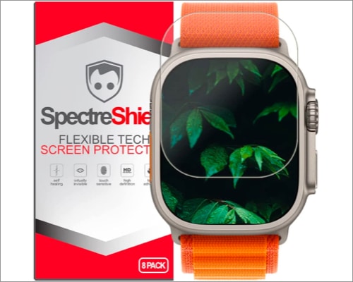 Apple Watch Ultra'nın Spectre Sheild ekran koruyucusu, tam kapsamlı bir TPU patentli cilt filmidir. Saat ekranını çıplak gözle tespit edilemez kalırken çiziklerden veya ani damla hasarından korur. Ayrıca, yüksek kaliteli şeffaf termoplastik film, ekranın netliğini ve canlılığını korur.