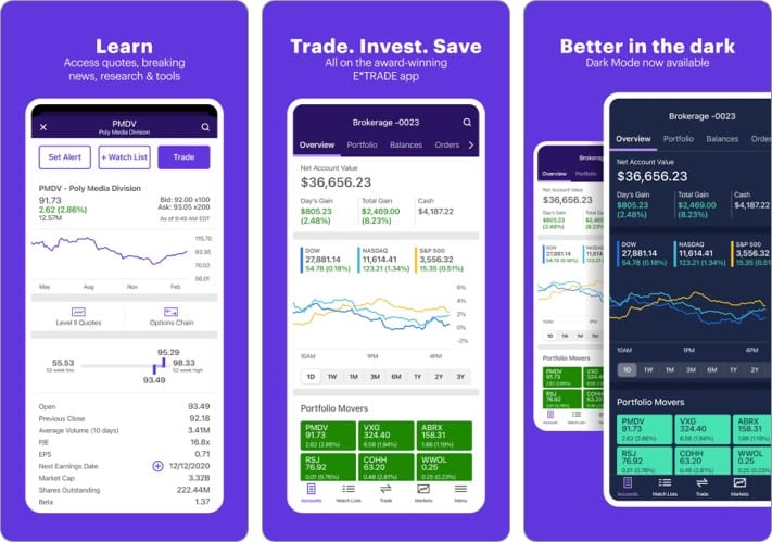 ABD'deki ilk çevrimiçi aracılık firmalarından biri olan Etrade, 1982'de faaliyete başladı ve o zamandan beri bir kullanıcı favorisi oldu. Uygulamanın Power ETrade platformu, seçenek ticareti ve aktif ticaret için en iyisidir.
