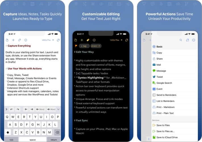 Uygulama ayrıca deneyimi özelleştirmek için çeşitli temaları ve uygulama simgelerini destekler. Kesintisiz paylaşım ve üçüncü taraf uygulama entegrasyonu en sevdiğim taslak işlevlerdir. Tek bir dokunuşla, taslaklarınızı Apple dosyalarına, iCloud Drive, Evernote, OneDrive, Google Drive, Google Dokümanlar'a kaydedebilir ve hatta WordPress platformuna gönderebilirsiniz. Düzenli!