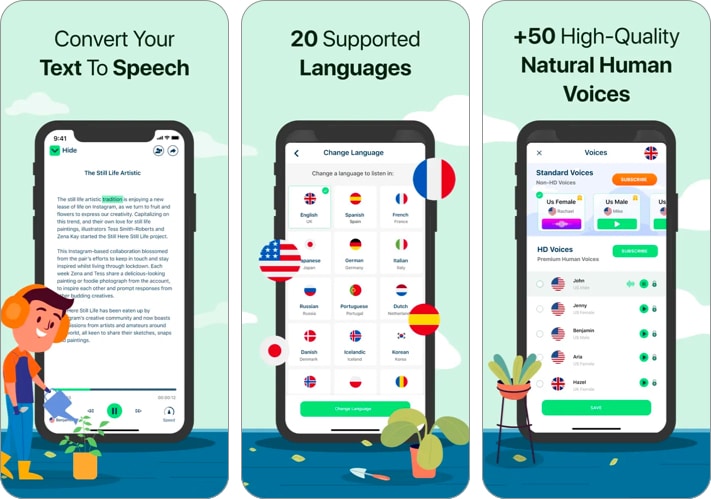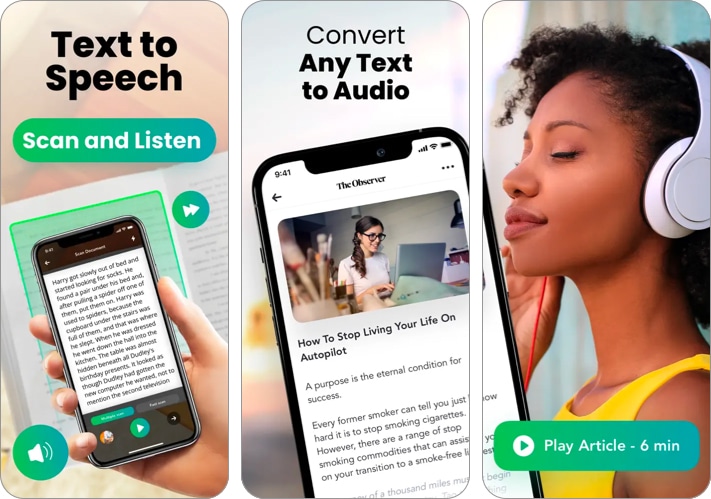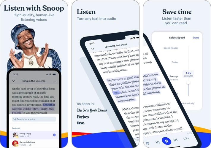 Speakiny, belgeler, makaleler, PDF'ler, e-postalar ve daha fazlası dahil olmak üzere çeşitli içerik türlerini dinlemenizi sağlayan harika bir metin-konuşma uygulamasıdır. 20 milyondan fazla kullanıcısı var ve App Store'daki en yüksek dereceli TTS uygulaması.