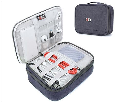 Bu yüksek kapasiteli teknoloji organizatörü, şarj cihazı, kablolar, kulaklıklar, sabit disk, bellek kartları ve diğer cihazlar gibi çeşitli elektronik dişlilerinizi saklamak için birden fazla elastik döngü ve cepli iki bölmeye sahiptir. İPhone'unuz veya iPad'iniz için 9,7 inç'e kadar yastıklı bir kese içerir.