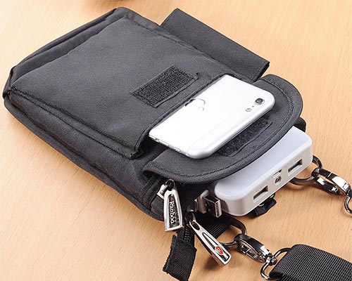 Kablo, kabloları ve kulaklıkları güvenli bir şekilde saklamanıza izin vermek için kısa elastik tepeli örgü cepli altı elastik yuvaya sahiptir. Velcro flep kapatma daha fazla esneklik sunar. Ayrıca, telefonu tutmanıza ve aksesuarları şarj etmenize izin vermek için iki elastik tepeli örgü cepli ikinci bir fermuarlı bölme var.