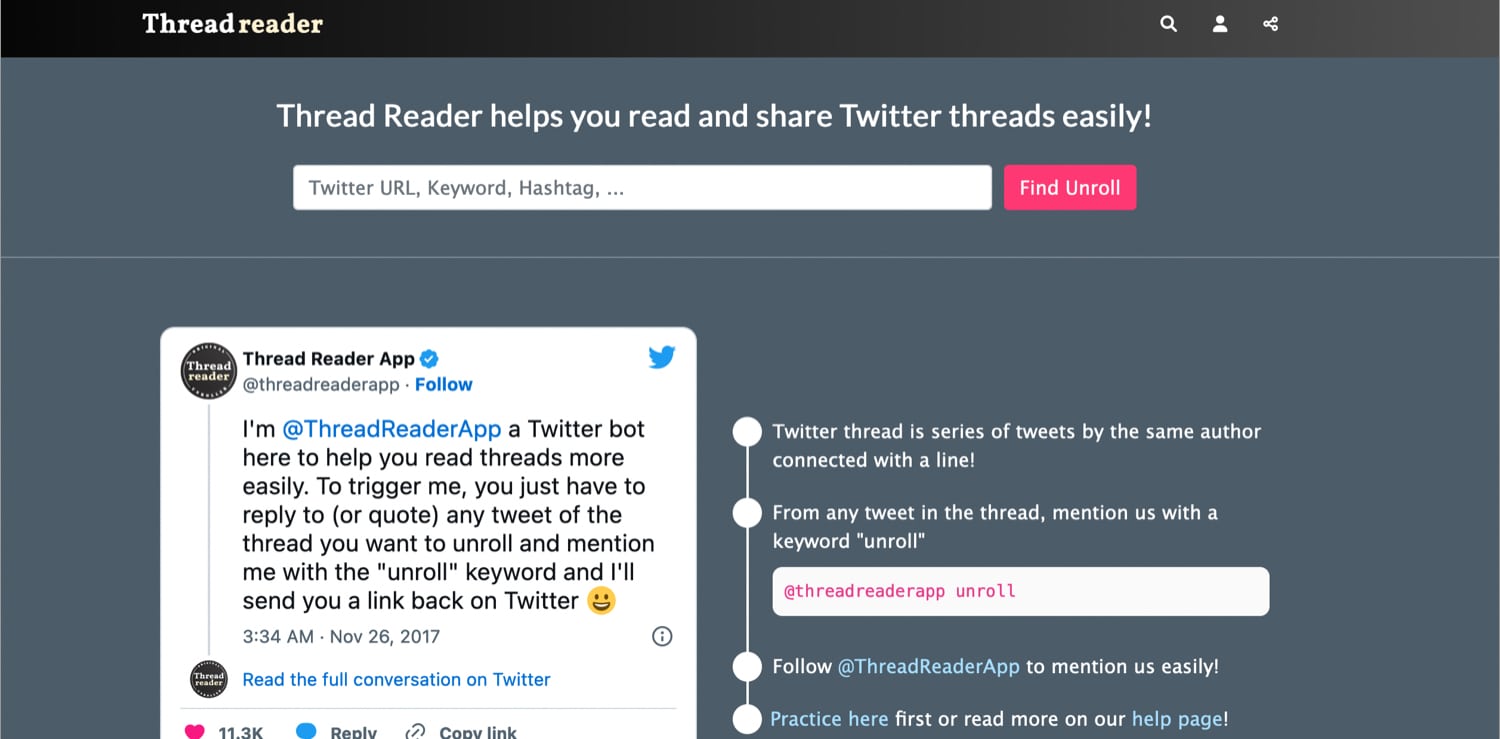 İş parçacığı okuyucu, Twitter deneyiminizi kullanıcı dostu özellikleri ile pürüzsüz hale getirir. Sağlam bot, Twitter iş parçacıklarını tek bir tweet'te açmanıza veya birleştirmenize yardımcı olur. Harika, değil mi? Sadece hareket halindeki tüm tweetleri okumanın, sürekli kaydırmayı atlamanın ne kadar uygun olacağını hayal edin. Portal, kullanıcı başına 3200 tweet'e erişebilir. Basit, kullanımı kolay ve hızlı.