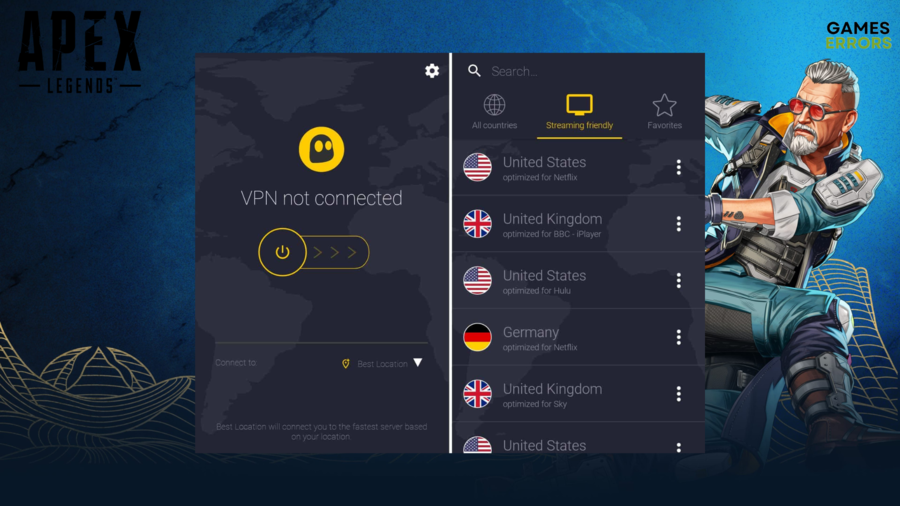Dünya çapında tonlarca sunucu ile, en iyisini kolayca bulabilirsiniz.Apeks efsanelerimaceralar. Dahası, Cyberghost'un kullanıcı dostu arayüzü onu hem yeni başlayanlar hem de deneyimli oyuncular için erişilebilir hale getirir.