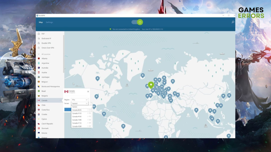 NordvpnOyun için optimize edilmiş geniş sunucu ağı nedeniyle Lost Ark için en iyi VPN'lerden biridir. Stratejik olarak dünya çapında yer alan düşük gecikme ve yüksek hızlı sunucular ile sınırsız ve pürüzsüz bir oyun deneyimi sağlar.