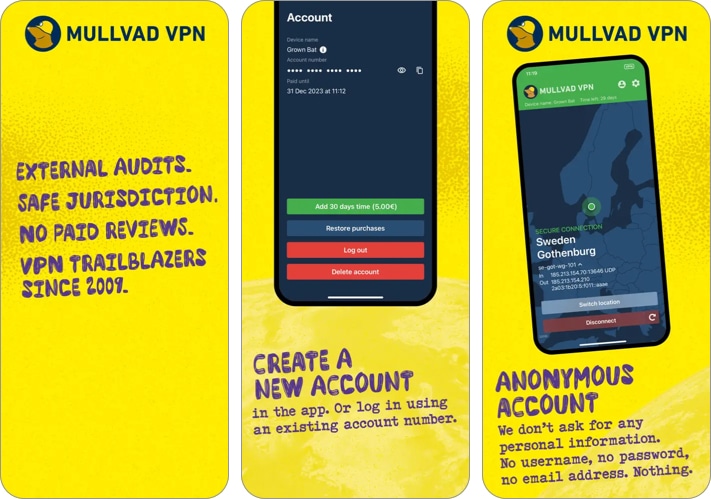 Deneyimlerime göre, Mullvad VPN'yi kullanıcı gizliliği söz konusu olduğunda en iyisi buldum. Bunun nedeni, diğer VPN uygulamalarından farklı olarak, bir hesap oluştururken herhangi bir kişisel bilgi sağlamanıza gerek yoktur. Bunun yerine, uygulama her kullanıcı için benzersiz bir hesap numarası oluşturur ve bir e -posta adresi veya diğer kişisel bilgilere olan ihtiyacı ortadan kaldırır.